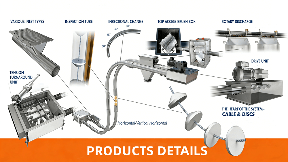 Tubular Cable Conveyor is a continuous conveying equipment for conveying powder, small particle and small block and other loose materials, which can be combined horizontal, inclined and vertical conveying.